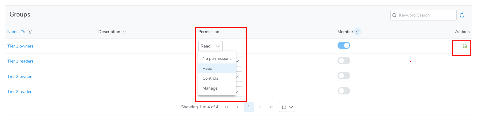 Select the group you want to associate by first selecting the role from the dropdown menu, then pressing the save icon on the right