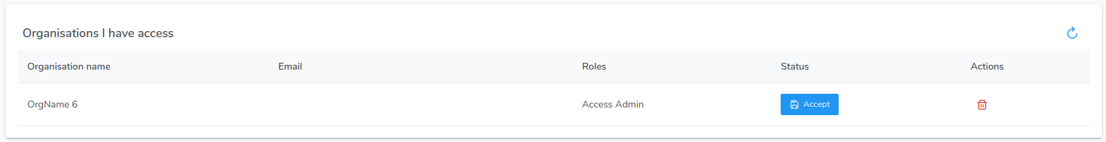 In the section “Organisation I have access” identify the organisation name that has invited you and press the “Accept” button